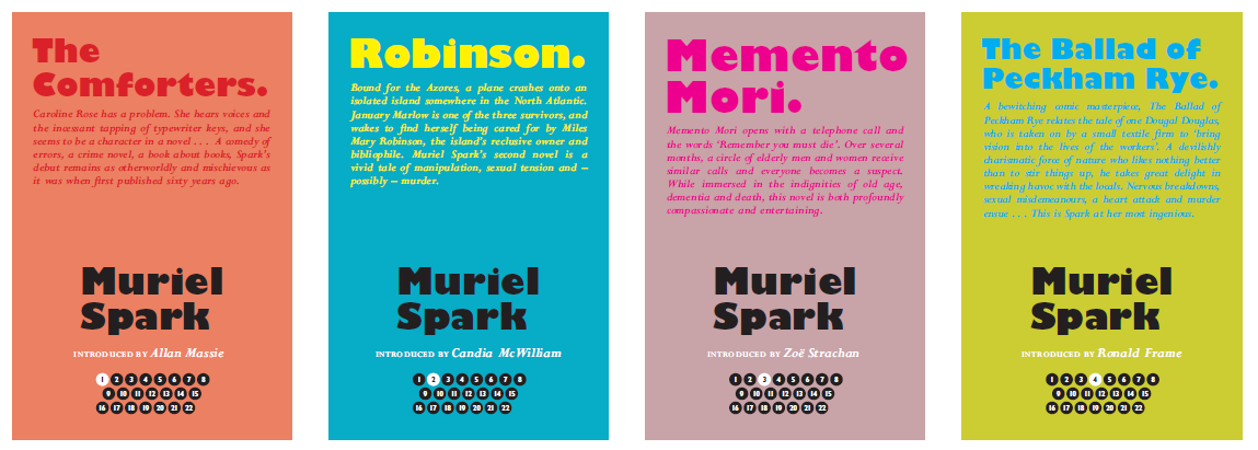 The first four are coming on 2 November this year and are The Comforters (978 1846974250), Robinson (978 1846974267), Momento Mori (978 1846974274) and The Ballad of Peckham Rye (978 1846974281). They are all £9.99, B-format hardbacks. A Far Cry from Kensington with an intro by William Boyd is then publishing in in early December, to coincide with a BBC Radio 4 Book of the Week (over two weeks) which will be running in January. These publications, along with a personal, anecdotal, indiscrete and admiring memoir of Muriel by Alan Taylor, Appointment in Arezzo (hb, £12.99, 978 1846973758) also published in November will mark the start of a year of fantastic celebration and media coverage. So far, the following is confirmed and there will be loads more to come!